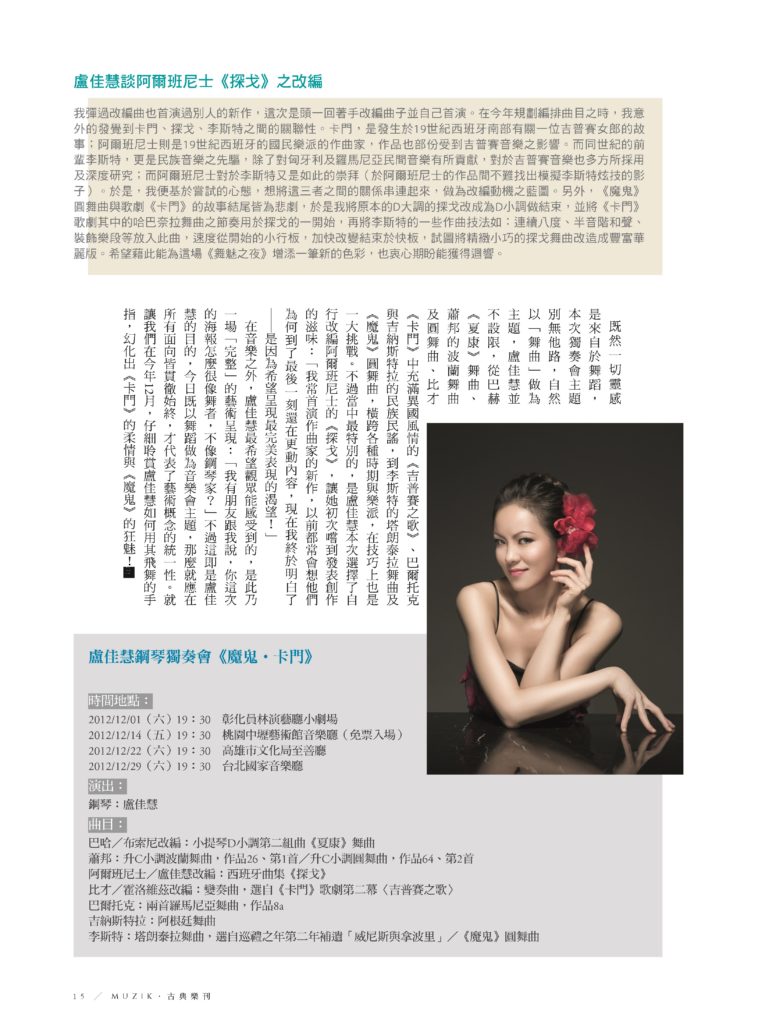 Muzik Magazine MEPHISTO CARMEN – Pianist Chia-Hui Lu 2012 Dec. 謬斯克 古典樂刊 No.71 專訪 琴鍵《魔鬼》舞動,化指《卡門》柔情-鋼琴家盧佳慧