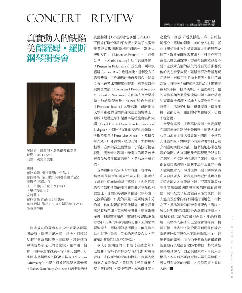 Muzik Magazine Concert Review : JEROME ROSE by Chia-Hui Lu 2011 June 謬斯克 古典樂刊 No.54 樂評 盧佳慧撰文《真實動人的缺陷美 傑羅姆.羅斯鋼琴獨奏會》