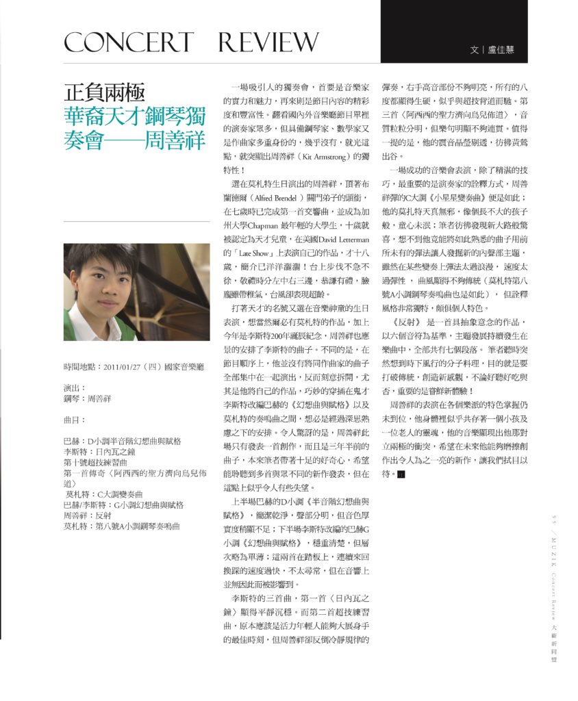 Muzik Magazine Concert Review : KIT ARMSTRONG by Chia-Hui Lu 2011 Feb. 謬斯克 古典樂刊 No.51 樂評 盧佳慧撰文 《正負兩極:華裔天才鋼琴獨奏會-周善祥》