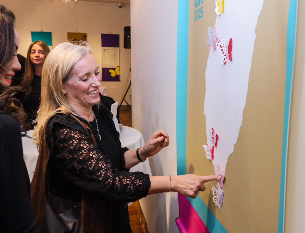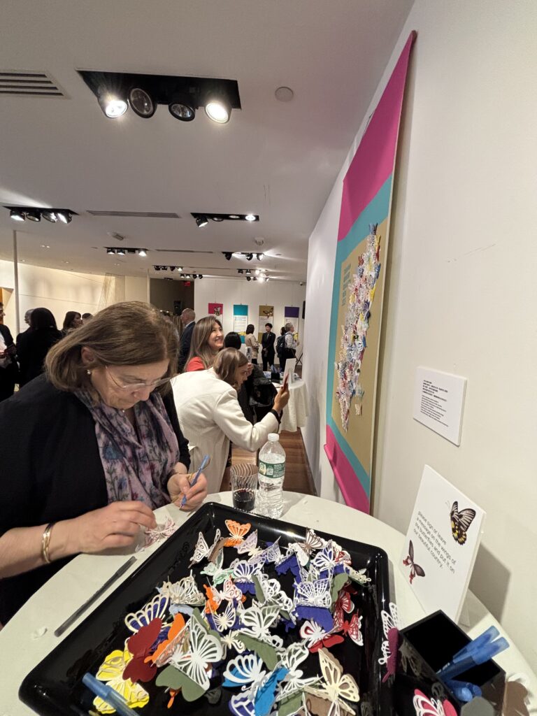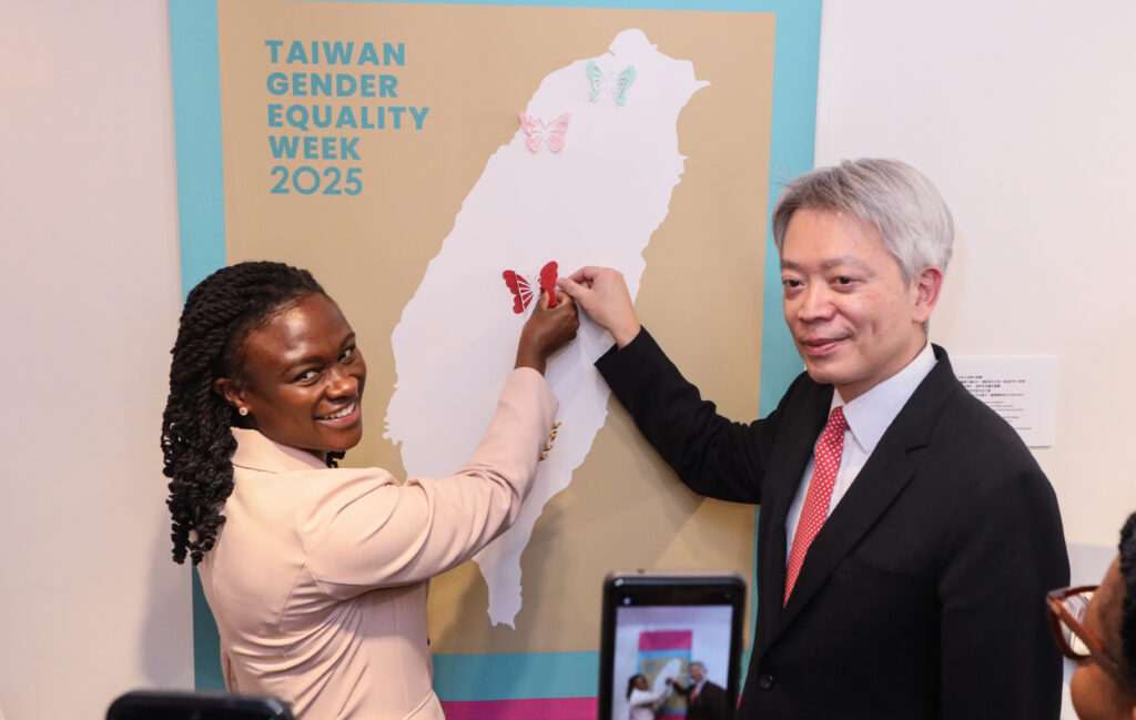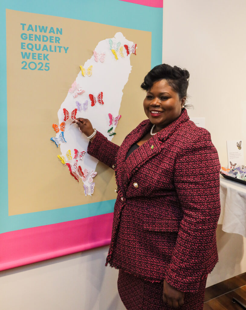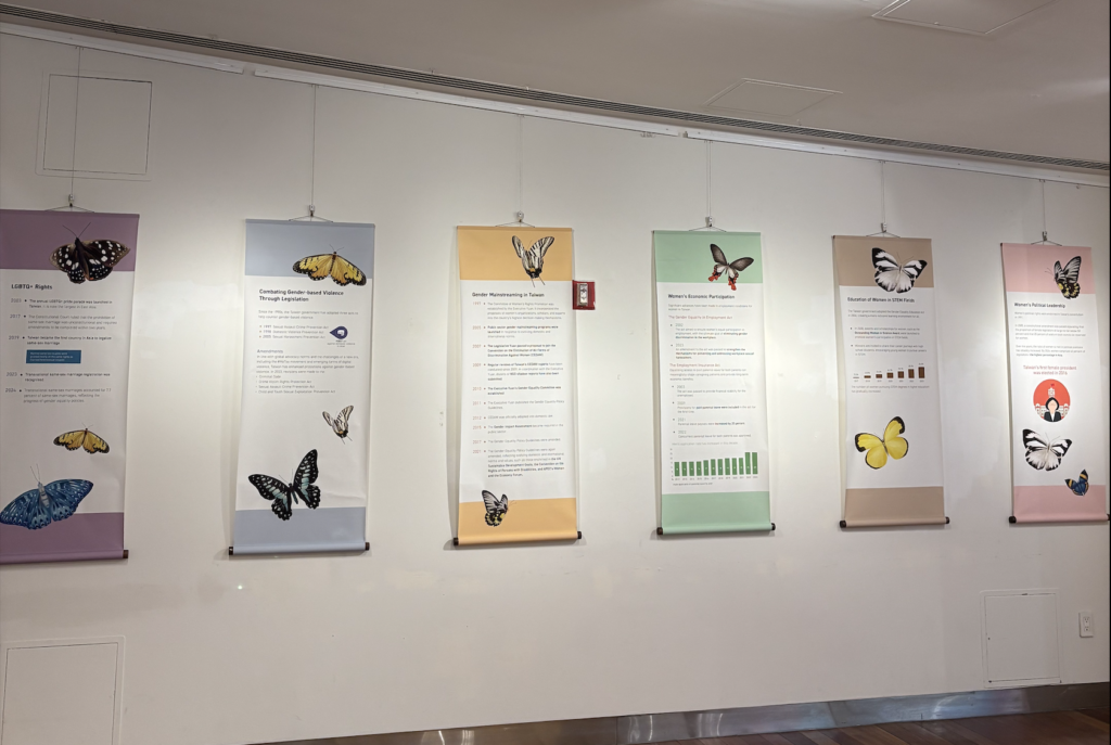 現場設置的「台灣女力展」,透過台灣各項性平數據亮點及進程,展現台灣在推動性別主流化、女性政治與經濟參與、女性在教育與STEM領域發展、立法對抗性暴力等成果,並邀請與會賓客參與共同藝術創作,以色彩斑斕的蝴蝶拼貼出台灣島嶼的形狀,代表女性在重重挑戰中蛻變而出,展現堅韌與獨立。