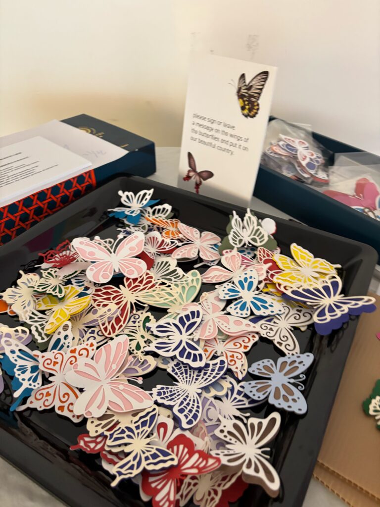 Curated by Chia-Hui Lu, the “Taiwan Women’s Power Exhibition” highlighted the historical progress of gender mainstreaming in Taiwan, showcasing women’s strength and pursuit of equality from the 1980s to present. Women are like butterflies, they experience metamorphosis and fly away beautifully. Taiwan is known as the kingdom of butterflies and butterflies are the centerpiece of this segment’s collaborative art installation. International guests contributed to a butterfly collage in the shape of Taiwan, symbolizing freedom, diversity, creative expression, and Taiwan’s resilience and ever-evolving identity.